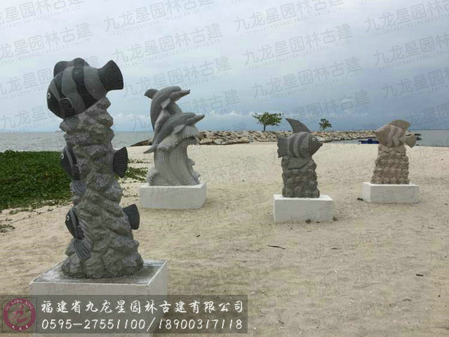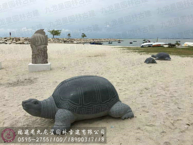 前年農(nóng)歷七月開始,海珠嶼大伯公廟這塊靠山臨海,占地10萬多方尺之地,經(jīng)過短短一年的人工美化,廟旁沙灘栽種一排排駿馬、靈鹿、孔雀、鳳凰等飛禽走獸的造型盆景,游客穿梭在植物走道弄潮看夕陽。沙灘上豎立起海龍王、蝦兵蟹將及石龜?shù)仁裥Σ[瞇與游客合照。來自中國惠安九龍星園林古建陳沂泉先生承包并制作該石雕工程項(xiàng)目。