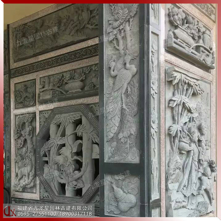 石雕浮雕壁畫(huà)在古建筑外墻中占據(jù)重要的地位。古建筑的石雕浮雕在內(nèi)容、形式和材質(zhì)上與圓雕一樣豐富多彩。建筑石雕浮雕常見(jiàn)的材料有青石、花崗巖、白麻、芝麻黑、羅源青、古田青等等。浮雕的雕刻技藝和表現(xiàn)體裁與圓雕基本相同。
